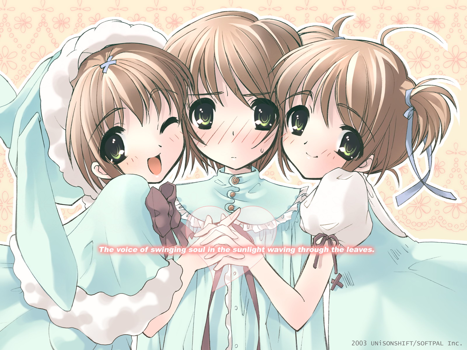 Description: Three girls in blue dresses are hugging each other and smiling at the camera with a pink background behind them.