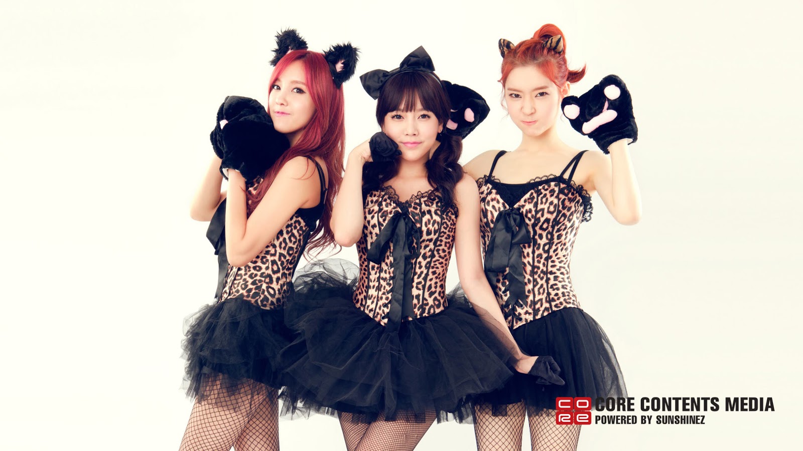 Description: Three girls in costumes posing for a picture together with their hands on their hipss and one holding a teddy bear.