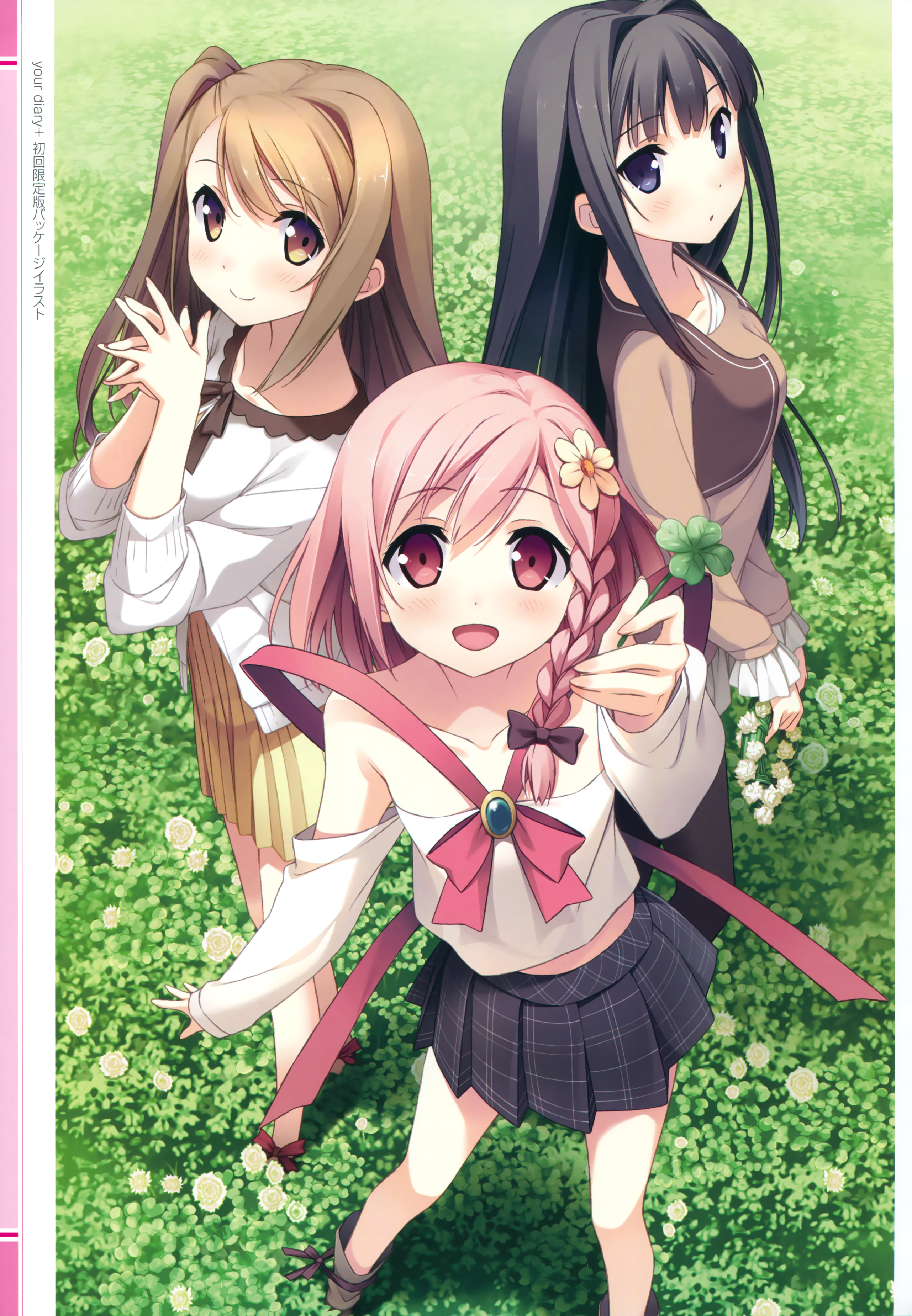 Description: Three girls in a field with grass and flowers in their hair and one girl with a flower in her hair.