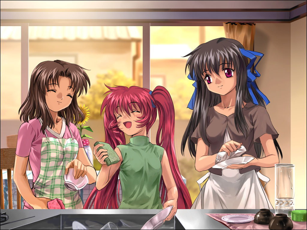 Description: Three girls standing in a kitchen with a plate of food in front of them and a window behind them.