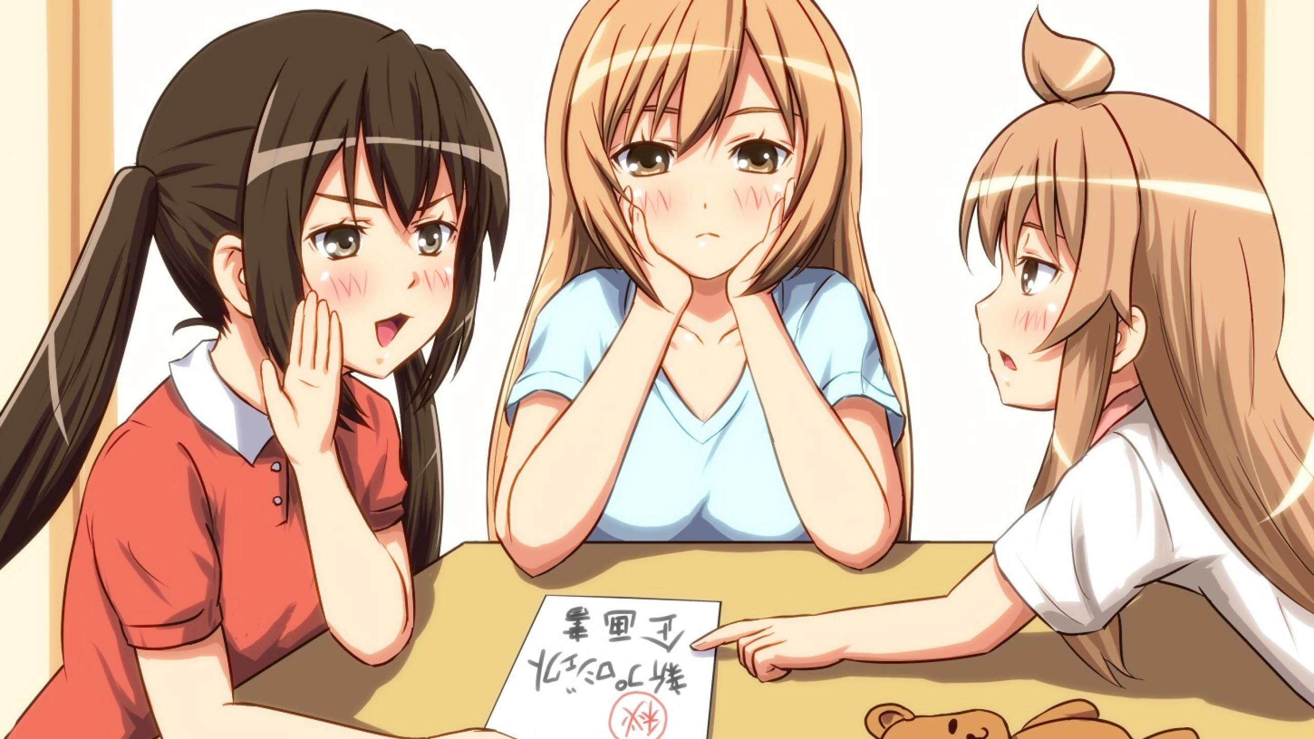Description: Three girls sitting at a table with a teddy bear in front of them and a sign that says.