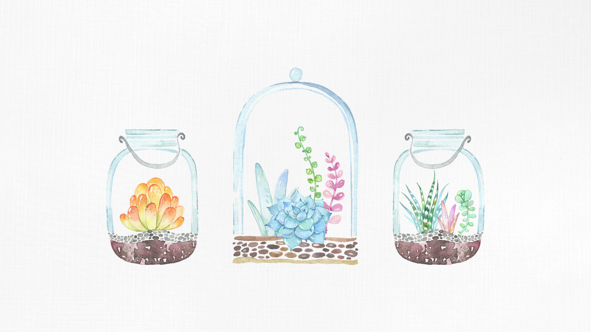 Description: Three glass jars with plants inside of them on a white surface with a white background and a white wall.