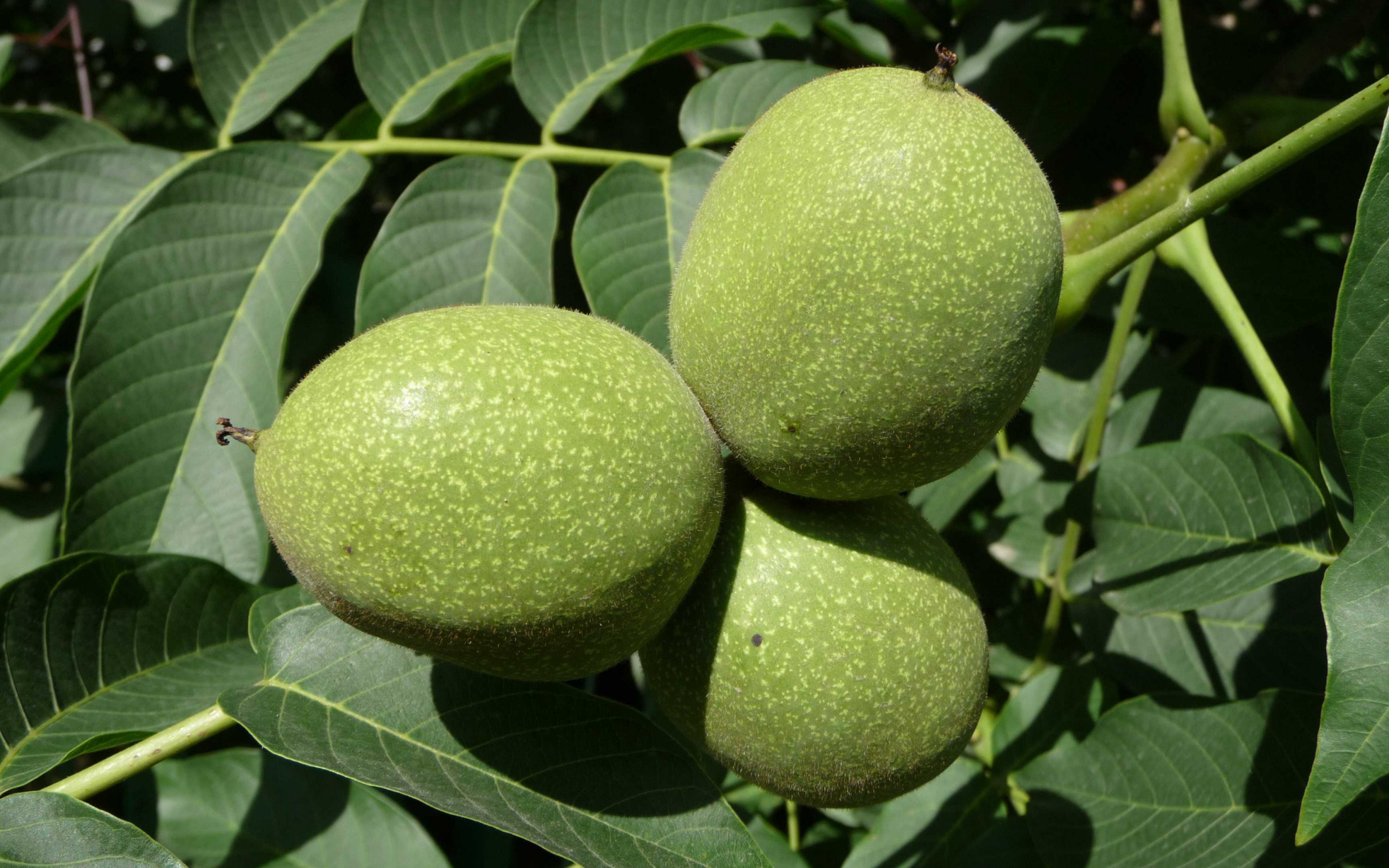 Description: Three green fruit hanging from a tree branch with leaves around it and a green background with leaves and a green stem.