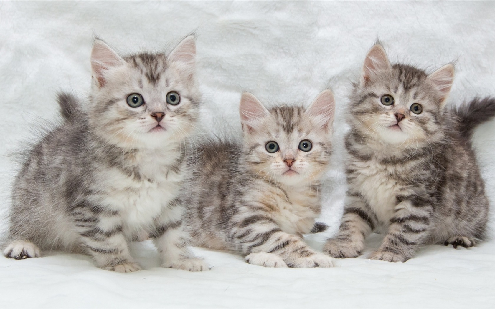 Description: Three kittens are sitting together on a white blanket and looking at the camera with a sad look on their face.