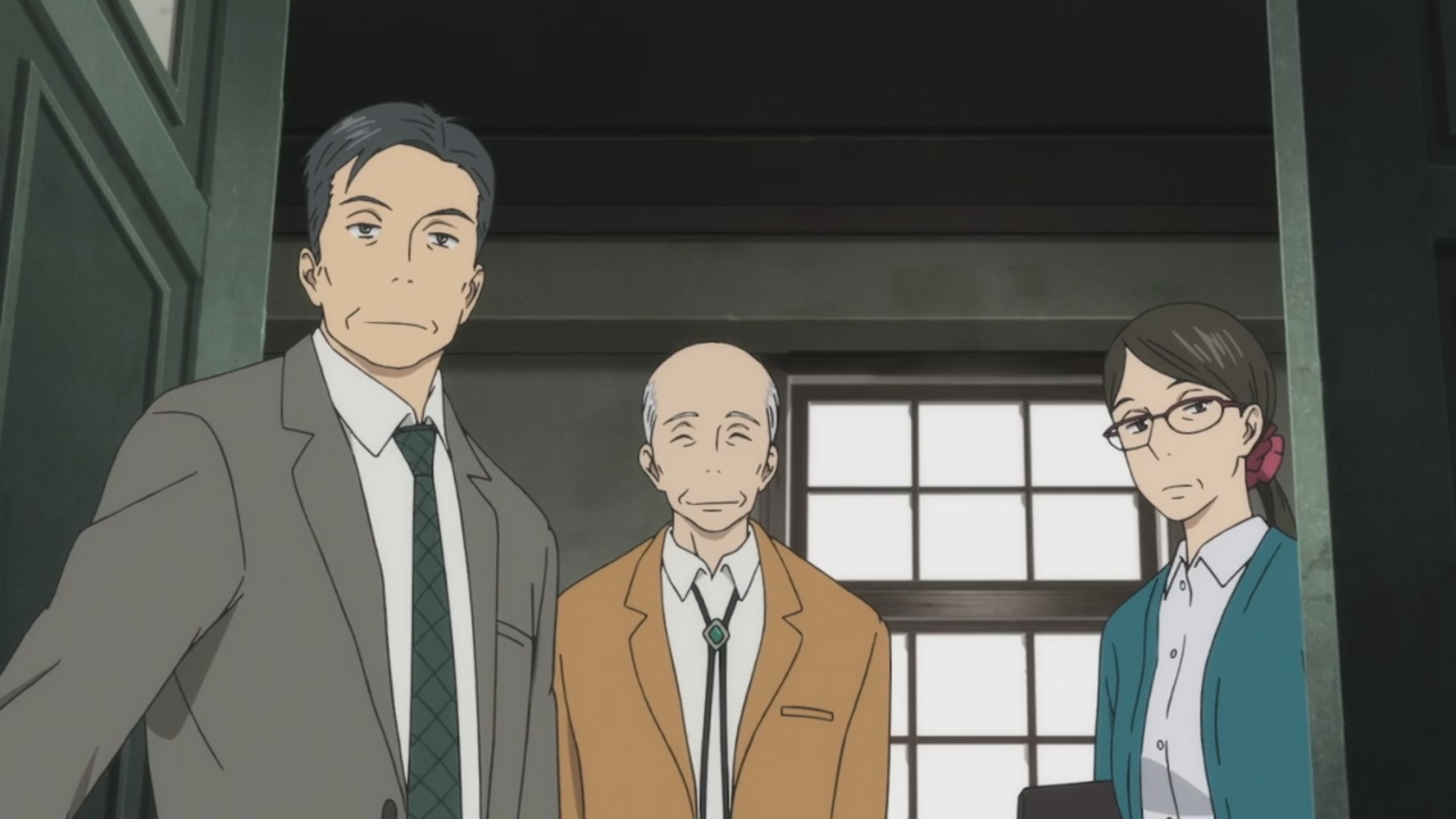 Description: Three men standing in a doorway with one looking at the camera and the other looking at the camera with a serious look on his face.