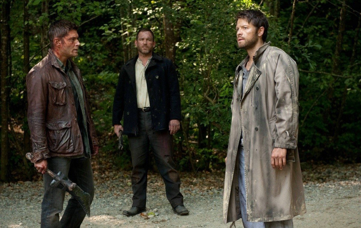 Description: Three men standing in a forest with one holding a knife and the other holding a hammer in his hand.