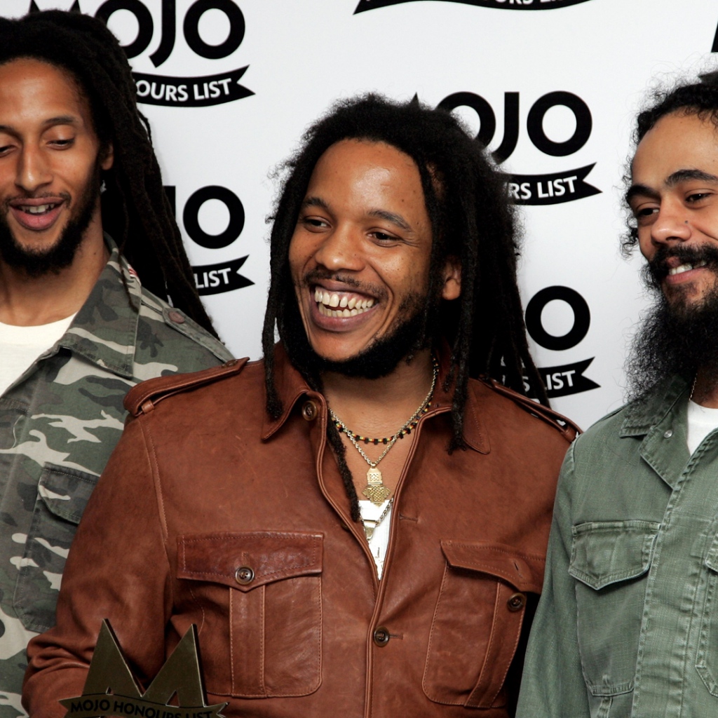 Description: Three men standing next to each other holding a trophy and smiling at the camera with a beard on their head.