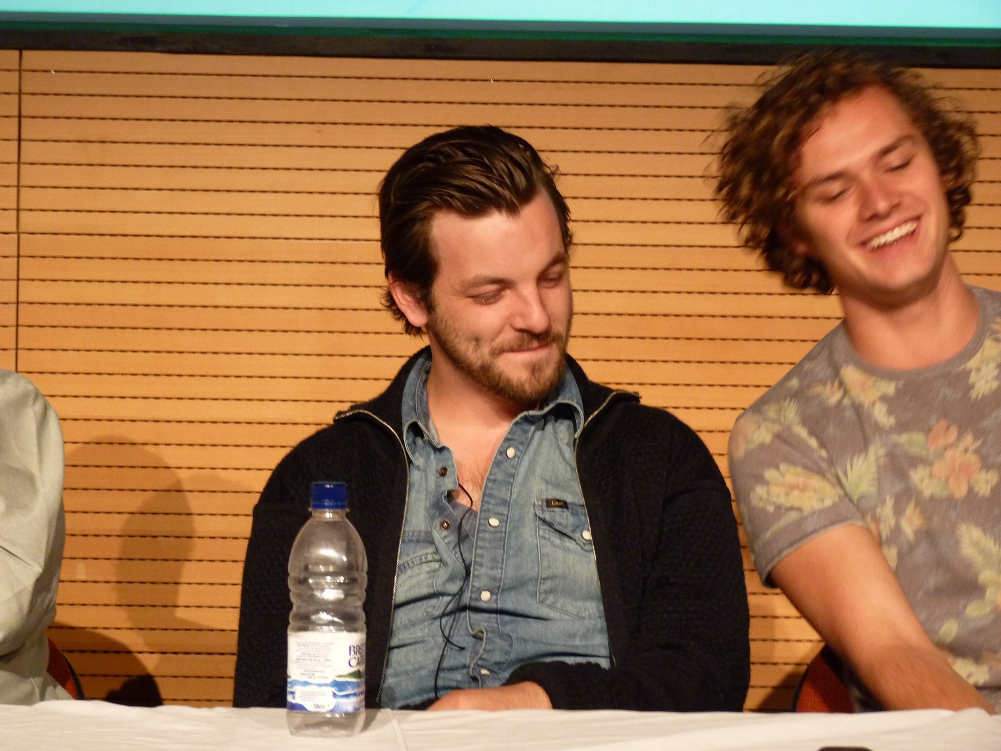 Description: Three men sitting at a table with a bottle of water in front of them and a window behind them.