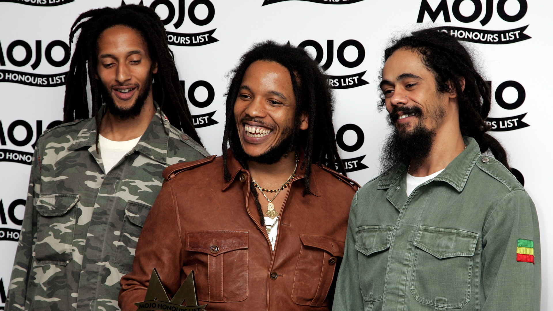 Description: Three men standing next to each other in front of a wall with a molono logo on it.