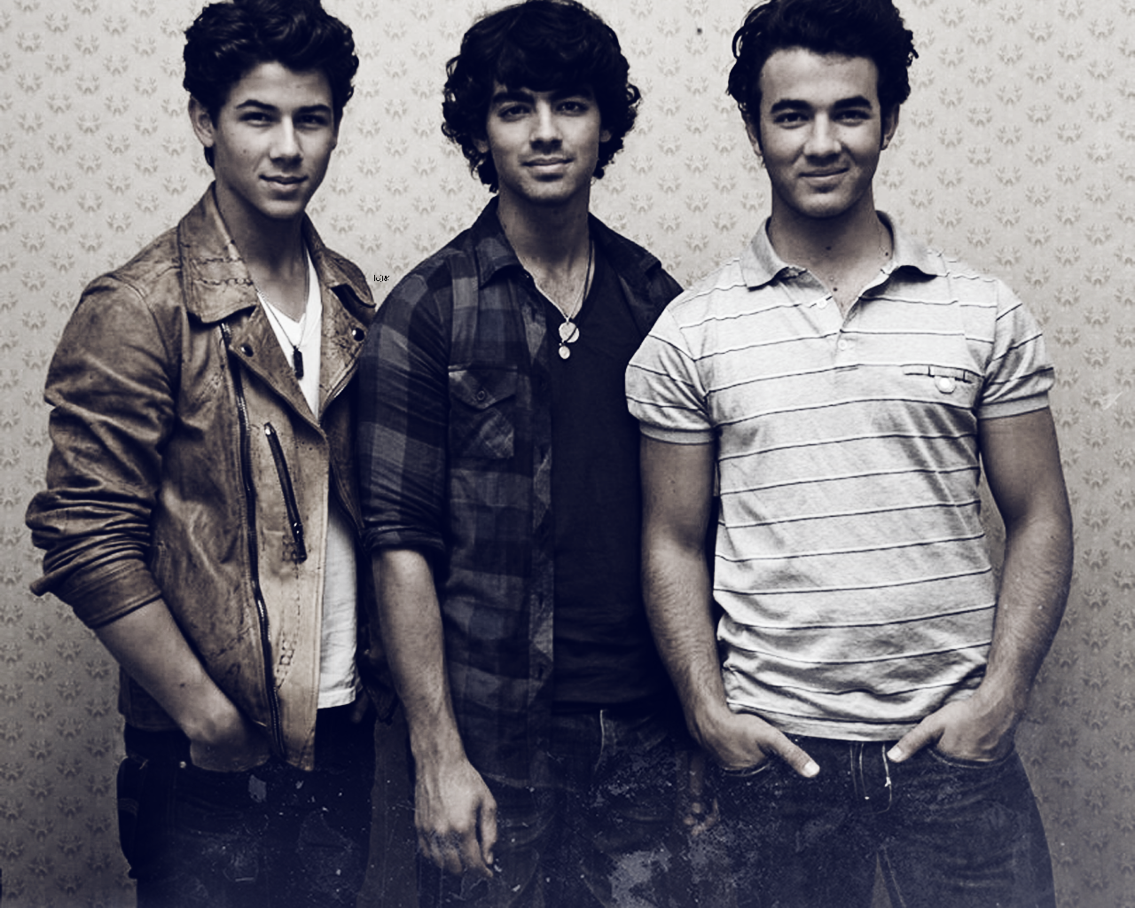 Description: Three men standing next to each other in front of a wall with a pattern on it and a wall paper behind them.