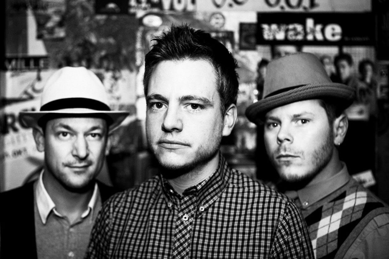 Description: Three men standing next to each other in front of a store front window with a sign on it that says wake.