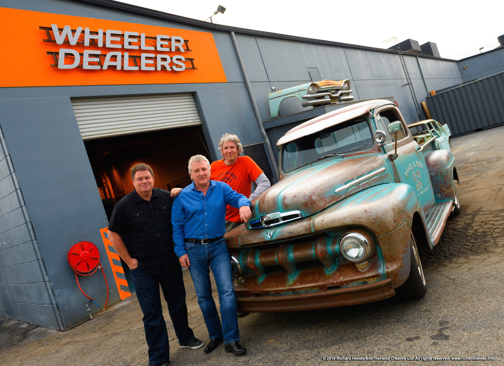 Description: Three men standing next to a truck in front of a building with a sign that says wheeler dealers on it.