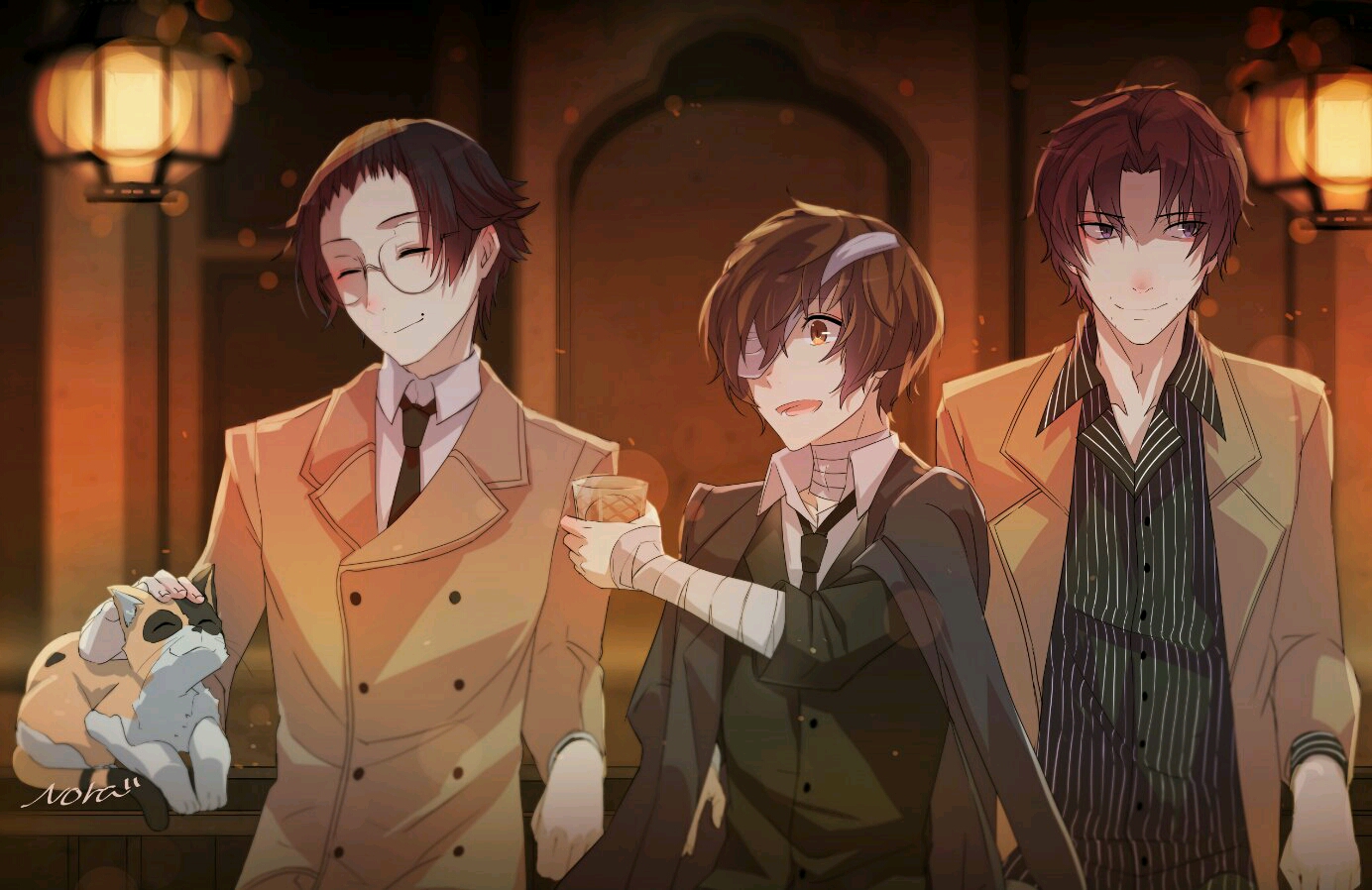 Description: Three people standing next to each other in front of a lamp post with a dog on it's lap.