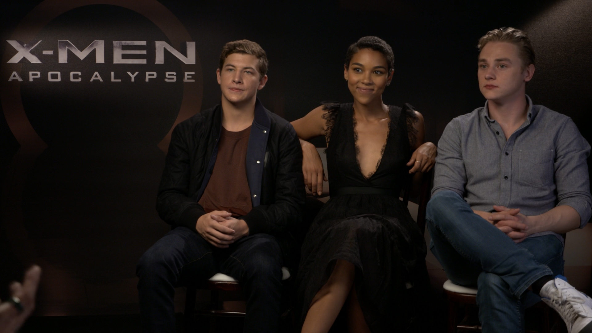 Description: Three people sitting on a chair in front of a sign that says x - men apocaalypse.
