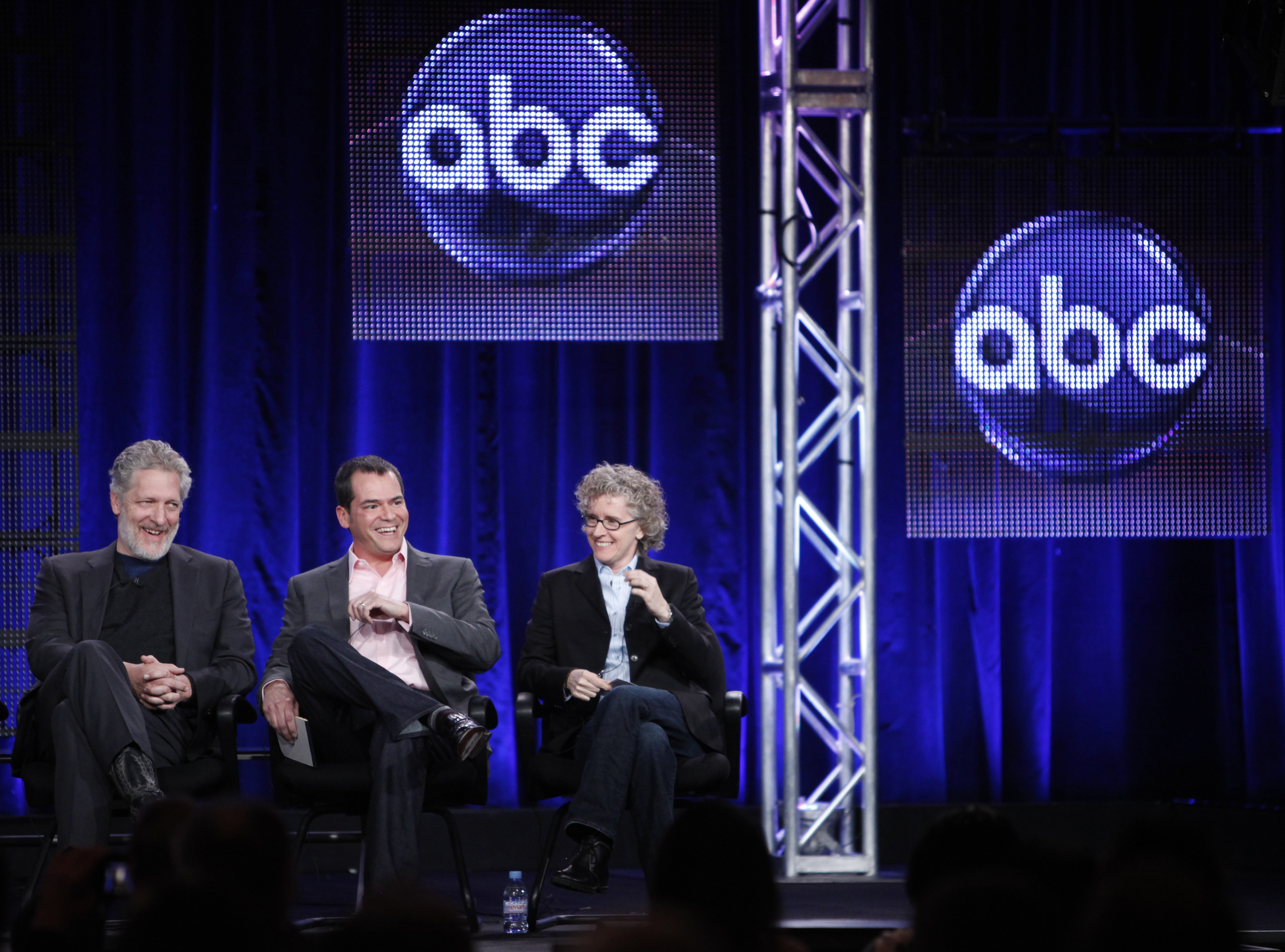 Description: Three people sitting on stage in front of a stage with a sign and a microphone in the background with a blue curtain.