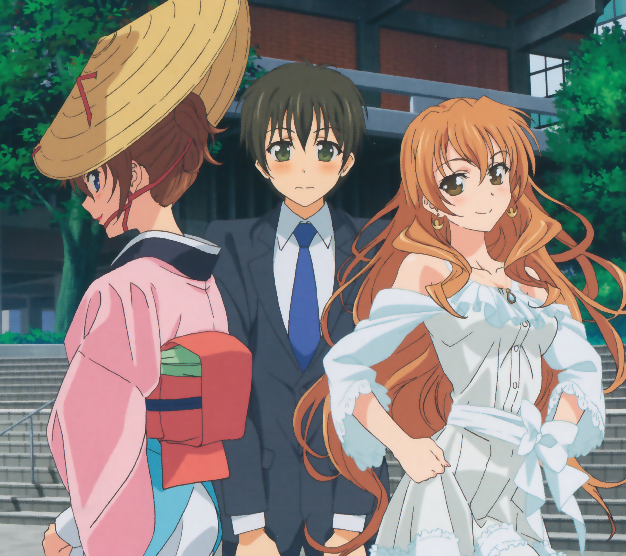 Description: Three people standing next to each other in front of a building with trees and stairs in the background.