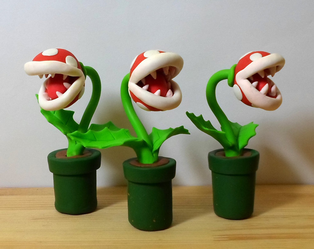 Description: Three plastic plants with mouths and leaves in them on a table top with a white wall behind them and a white wall behind them.