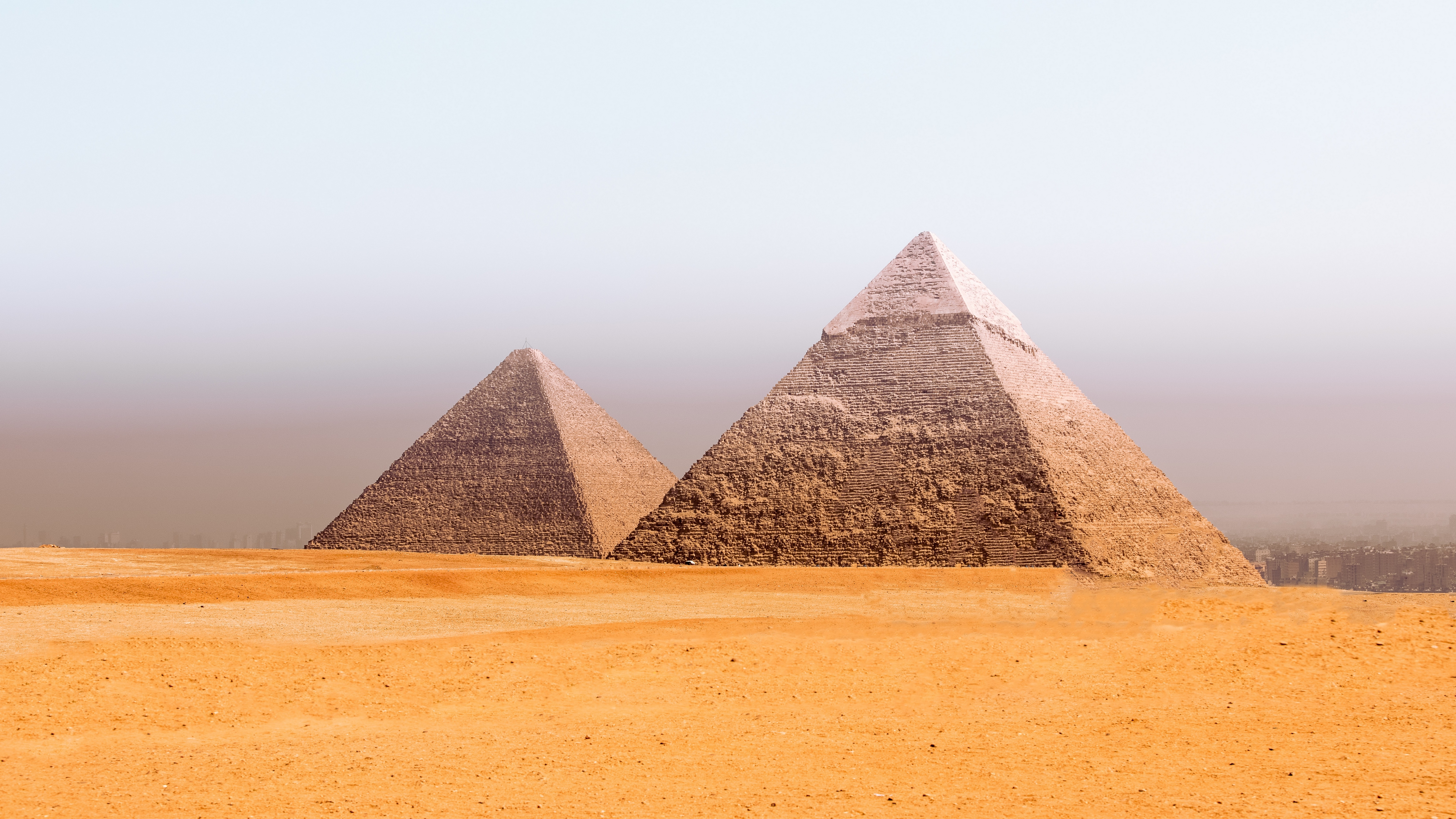 Description: Three pyramids in a desert with a hazy sky in the background.