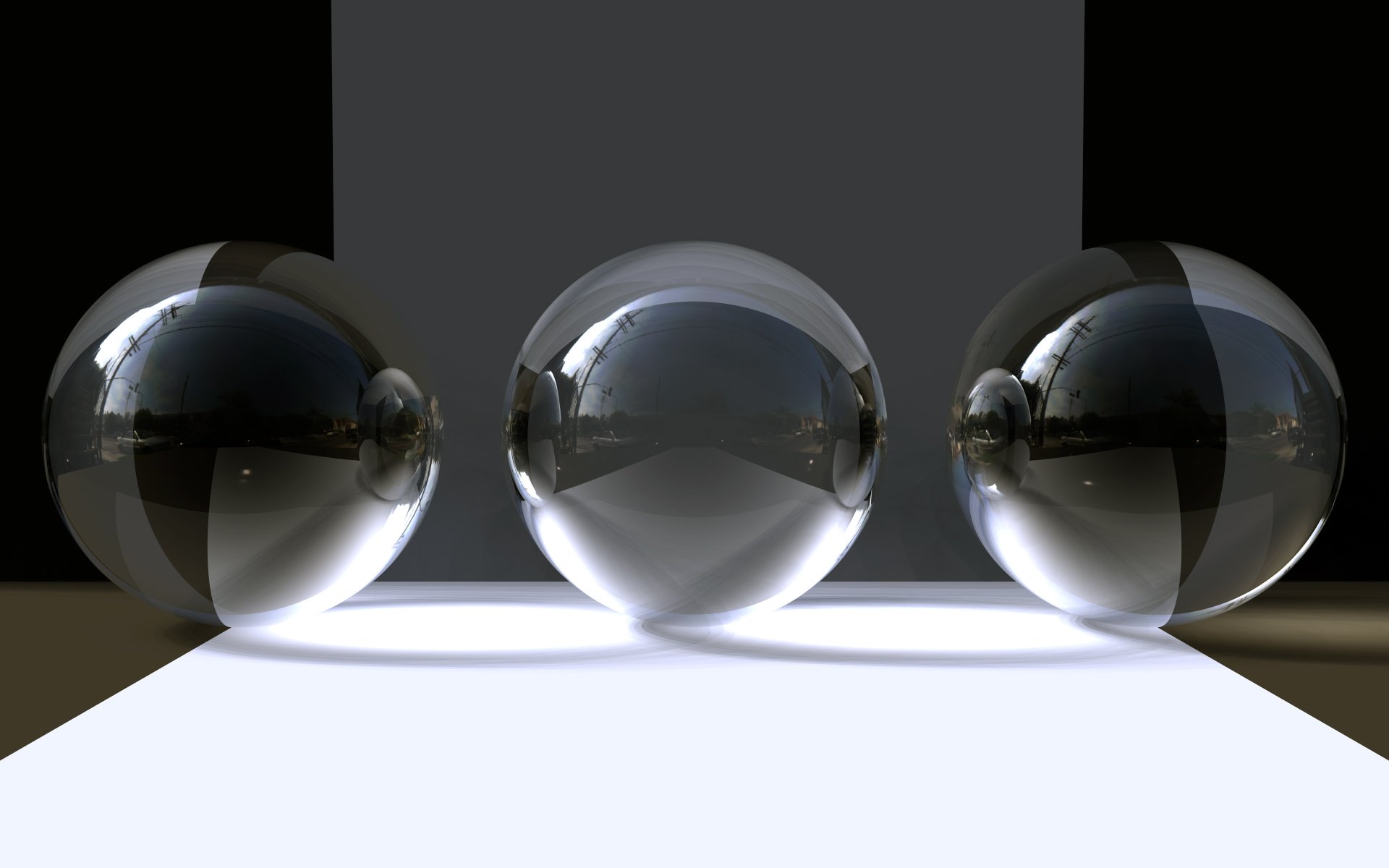 Description: Three shiny balls are on a white surface with a shadow on the floor behind them and a black wall behind them.