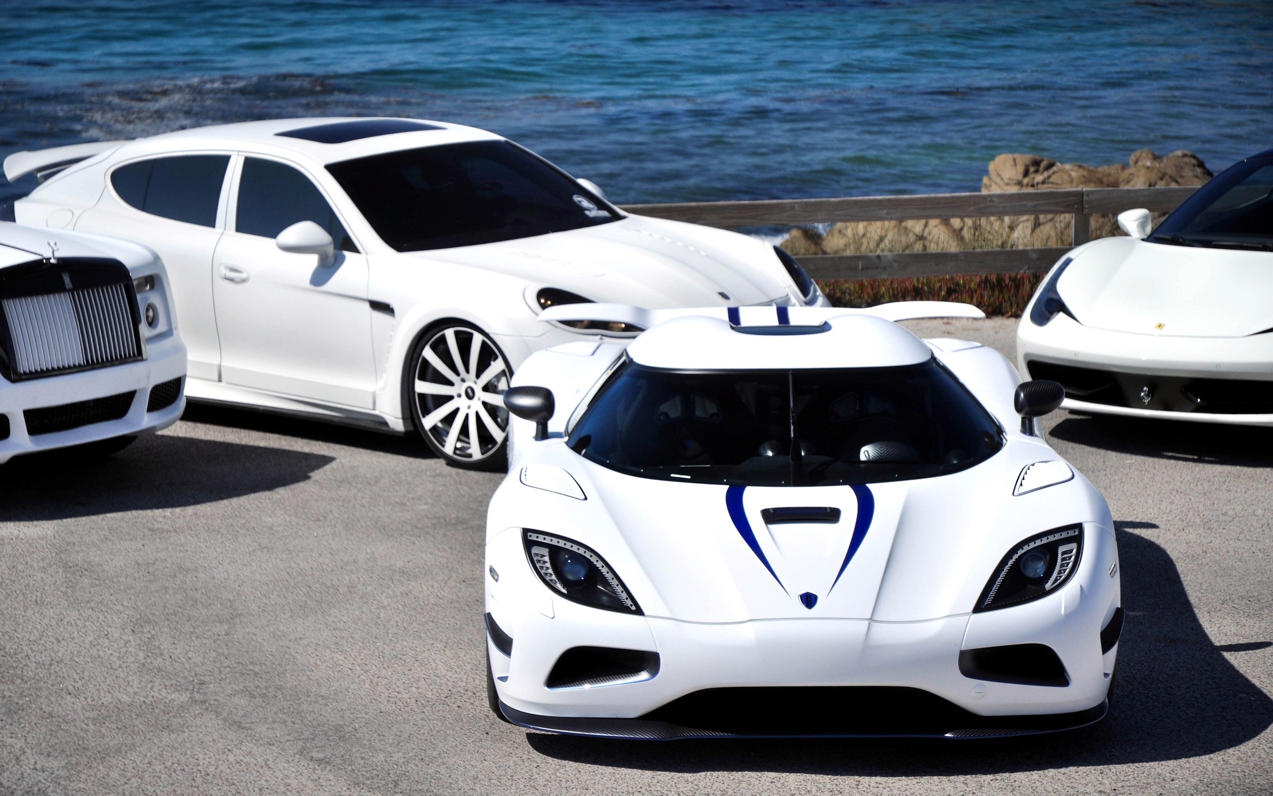 Description: Three white sports cars parked next to each other on a road near the ocean and rocks.