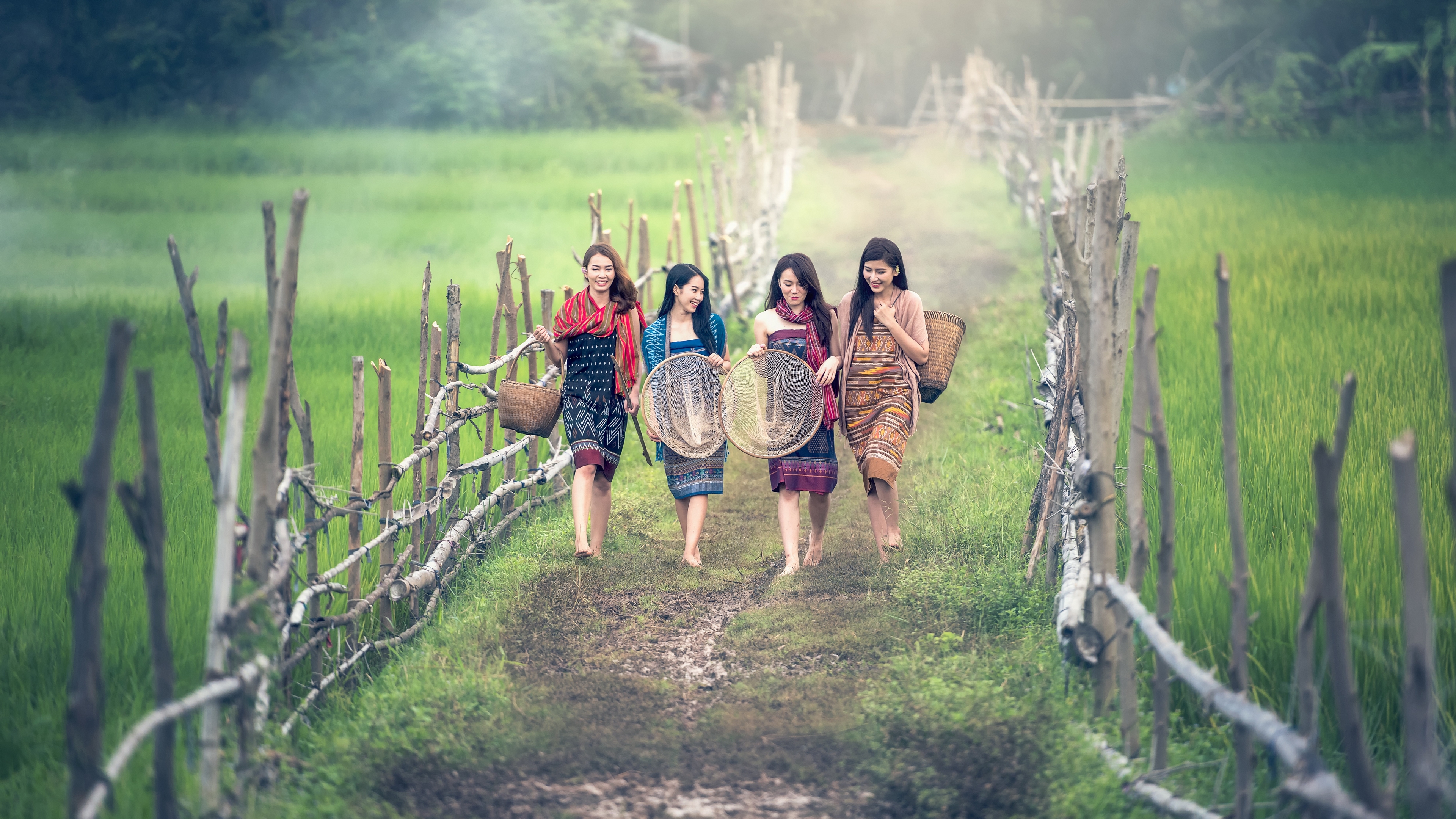 Description: Three women walking down a dirt road carrying baskets and a barrel of water on their backs.