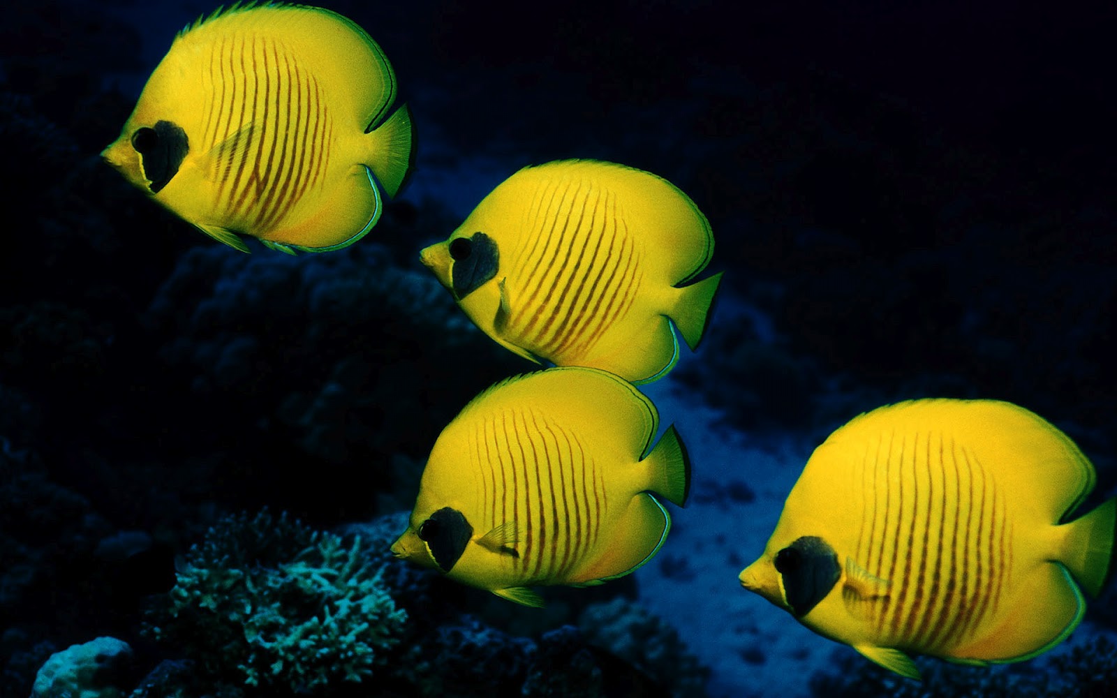 Description: Three yellow fish swimming in the ocean together on a reef of a coral reef with blue water and corals.