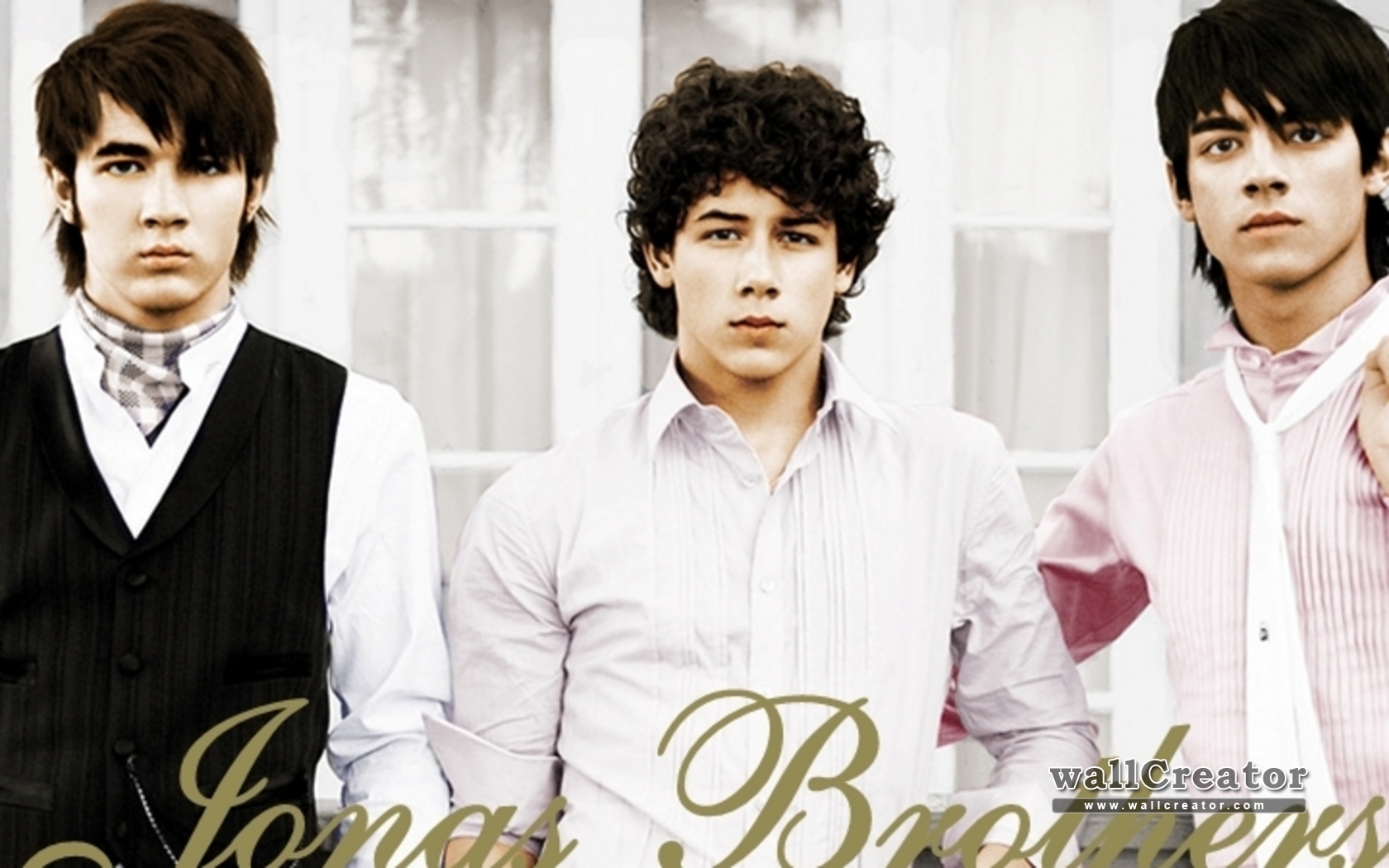 Description: Three young men standing next to each other in front of a window with the words john brothers on it.