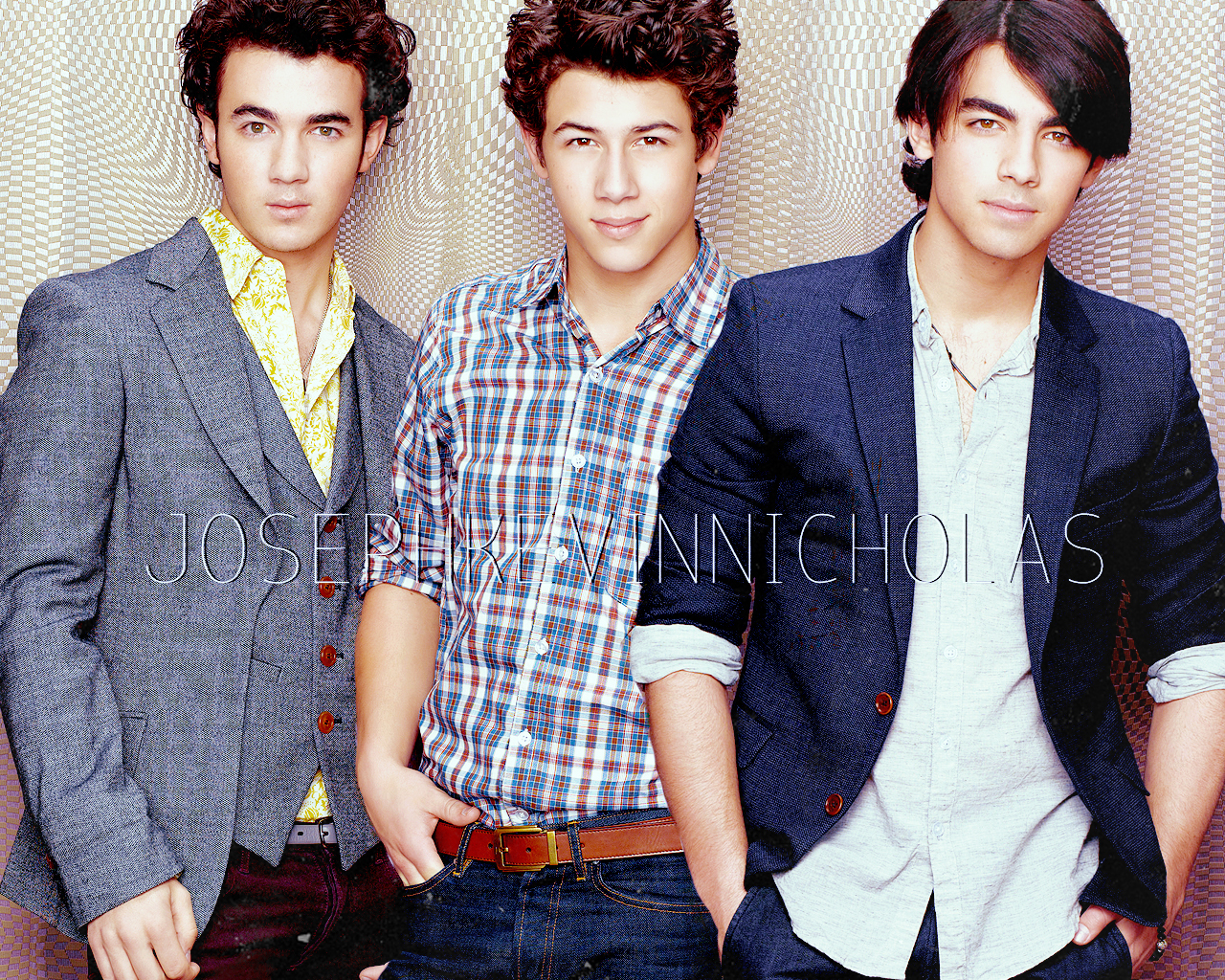 Description: Three young men standing next to each other in front of a wall with a pattern on it and one man wearing a suit.