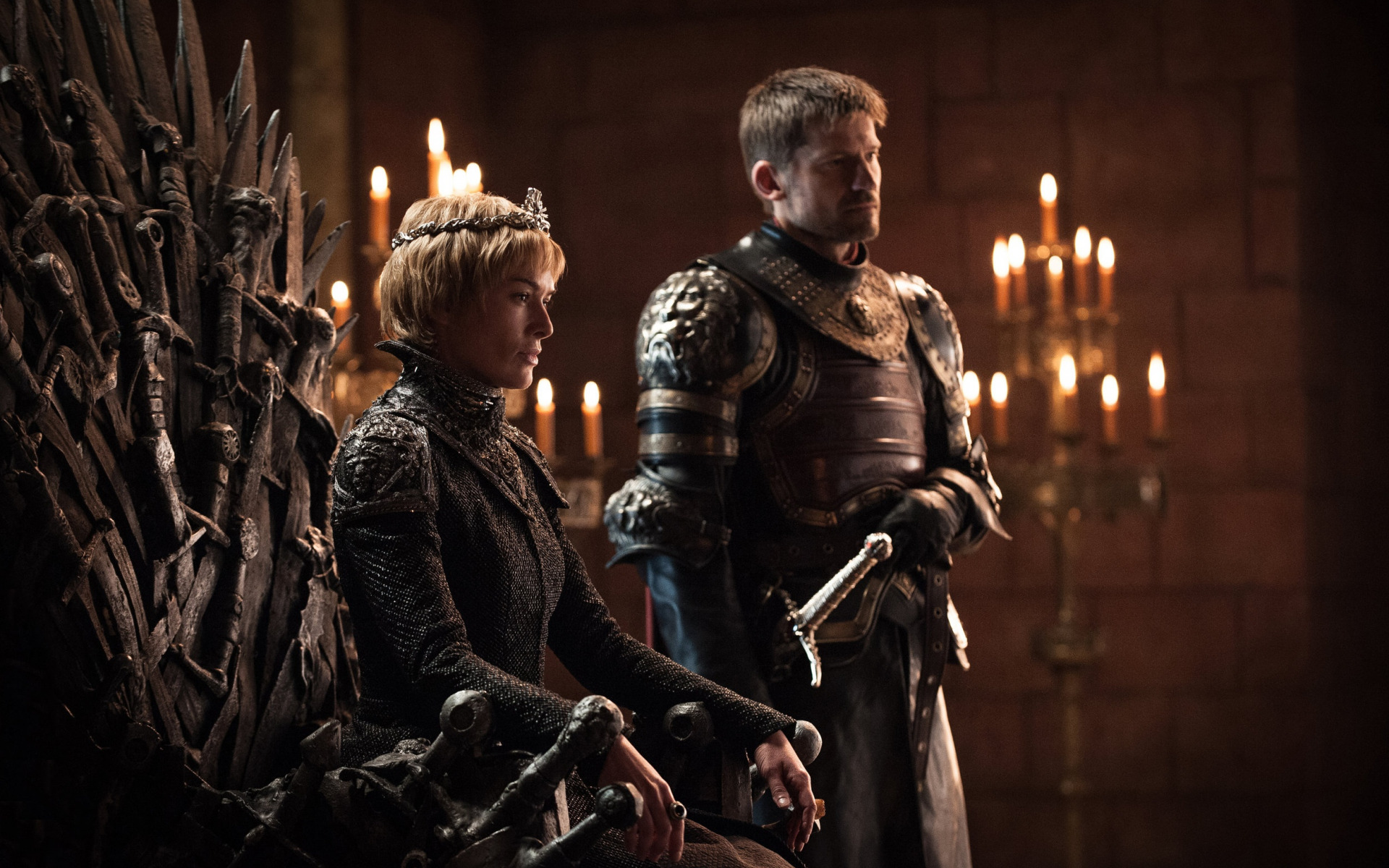 Description: A man and a woman standing next to each other on a throne with candles in the background and a chandelier in the background.
