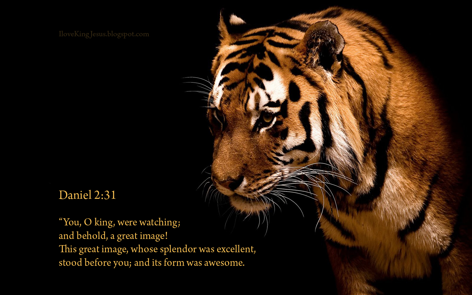 Description: A tiger with a bible verse on it's face and a black background with a quote from the book.