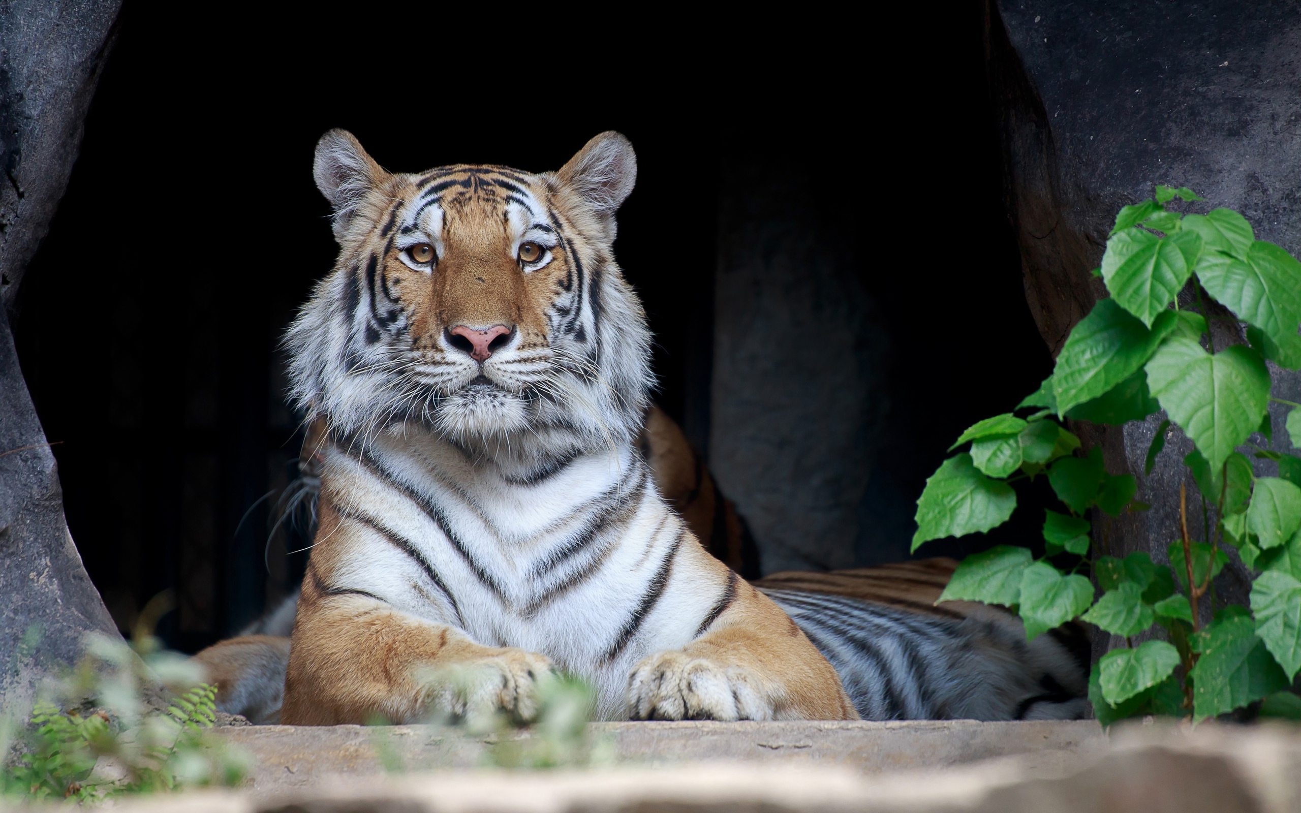Description: A tiger laying down in a cave with a plant in the background and a rock wall behind it with a plant growing out of it.