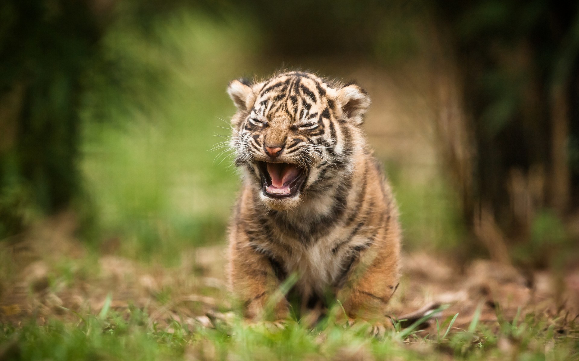 Description: A tiger cub yawns in the grass and leaves of a forest area.