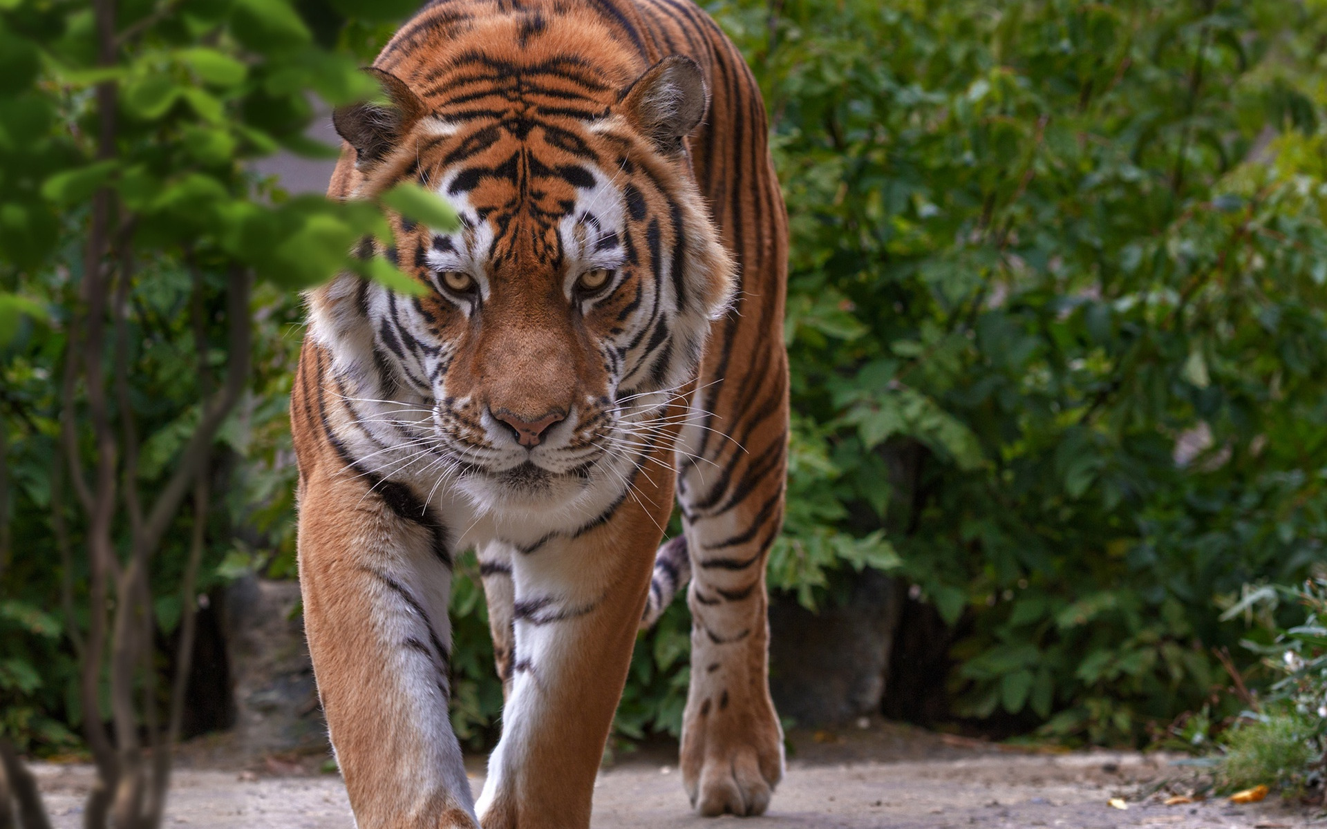 Description: A tiger walking down a dirt road next to a forest of trees and bushes with green leaves on it.