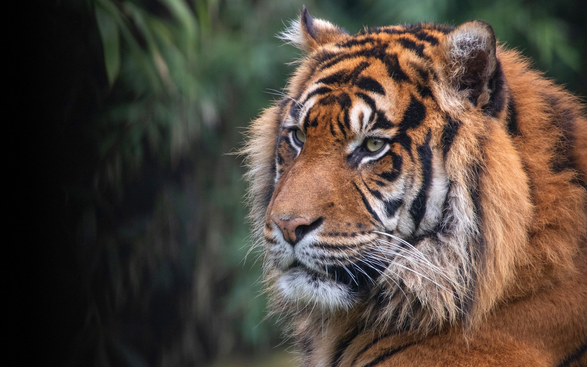 Description: A tiger is looking at something in the distance with trees in the background and a blurry background behind it.