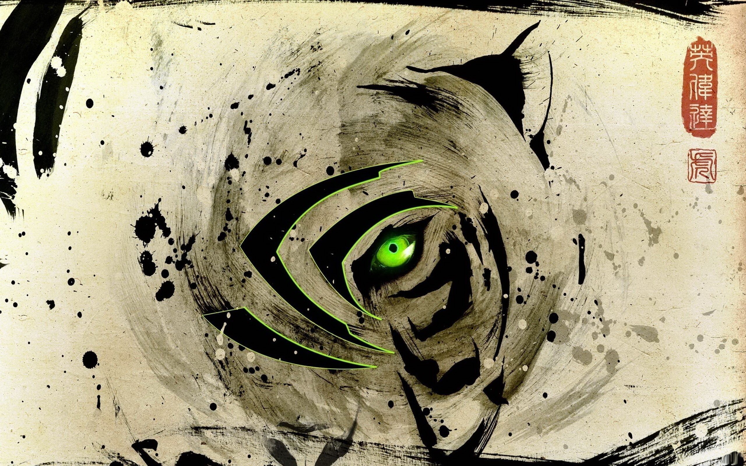 Description: A picture of a tiger with green eyes in a spiral design with chinese writing on it and a black and white background.