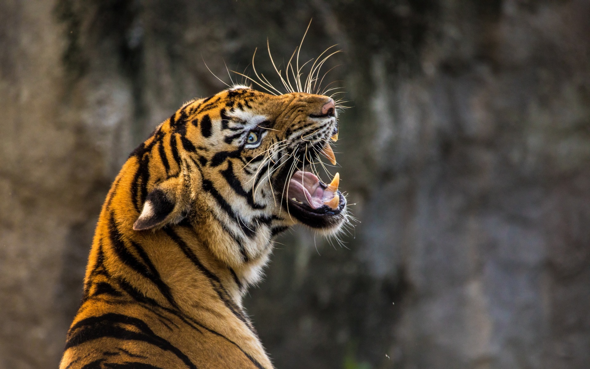 Description: A tiger is growling at something in the distance with its mouth open and it's mouth wide open.