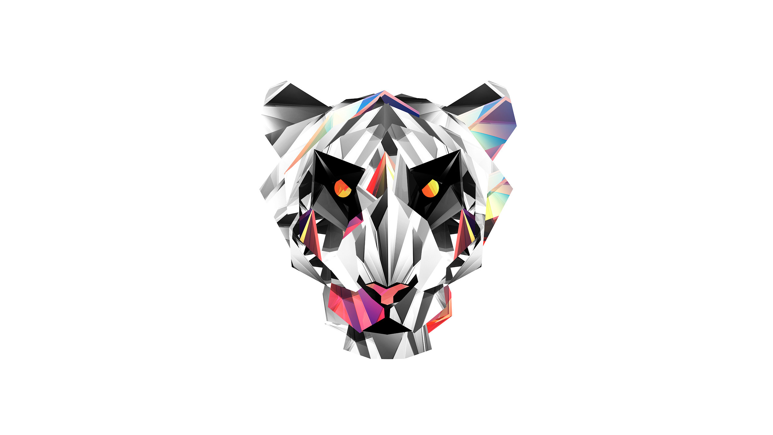 Description: A tiger head made up of many different colors and shapes on a white background with a black outline and a red eye.