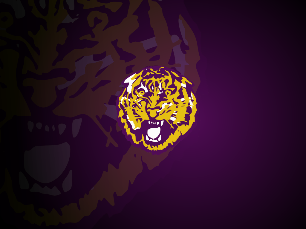 Description: A tiger's head with a purple background and yellow highlights on it's face and mouth.