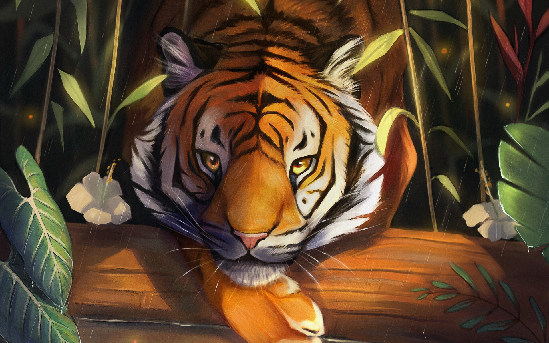 Description: A tiger is laying down in the jungle with its head on a log and looking at the camera with a smile.