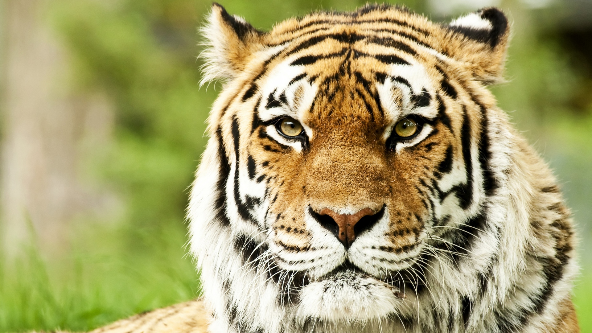 Description: A tiger is laying down in the grass looking at the camera with a serious look on his face and eyes.