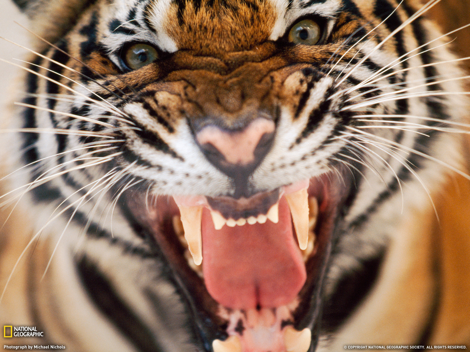 Description: A tiger with its mouth open and it's teeth wide open and showing teeth and teeth missing teeth.