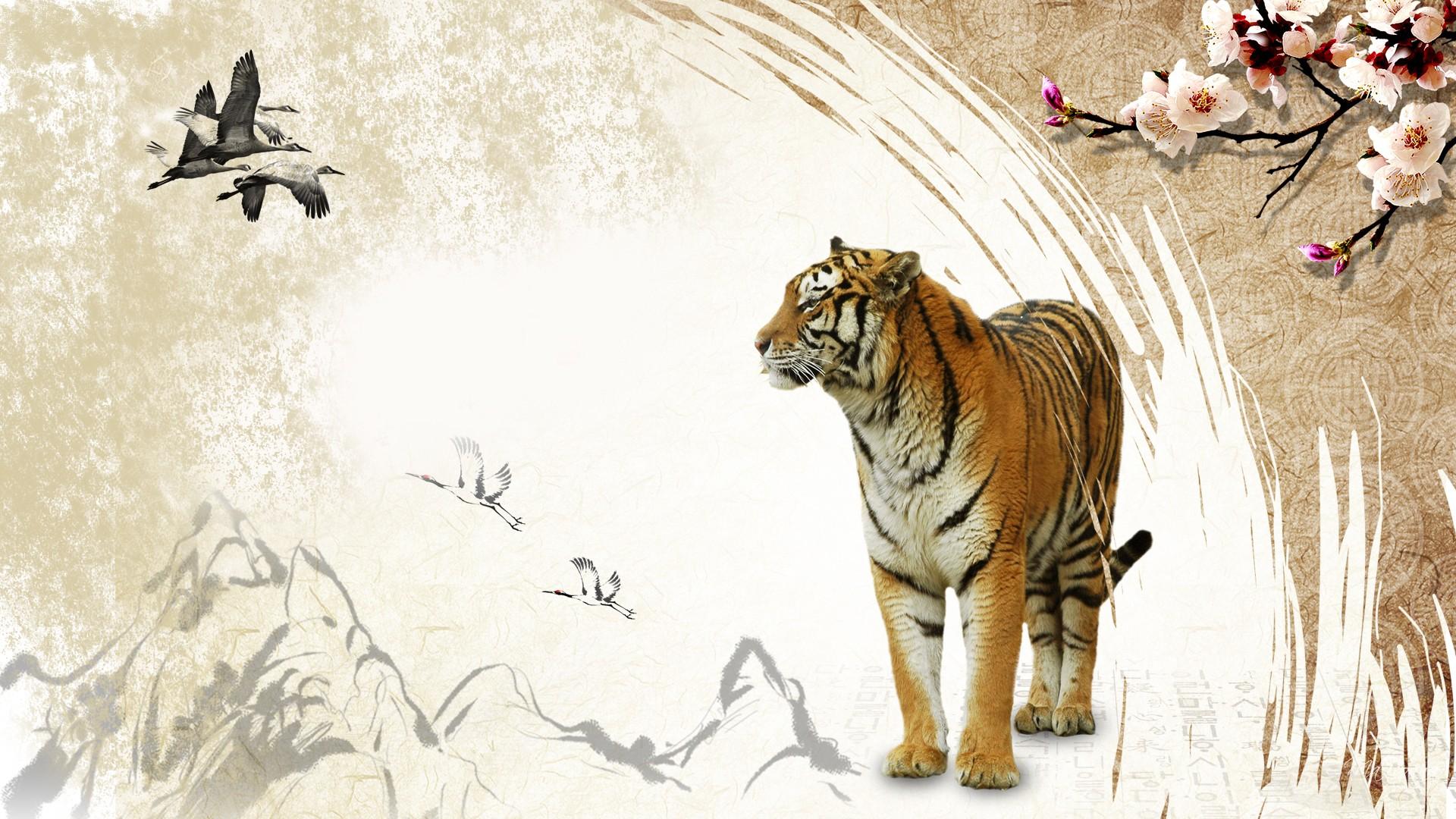 Description: A tiger standing in front of a painting of flowers and birds on a wall with a background of birds.