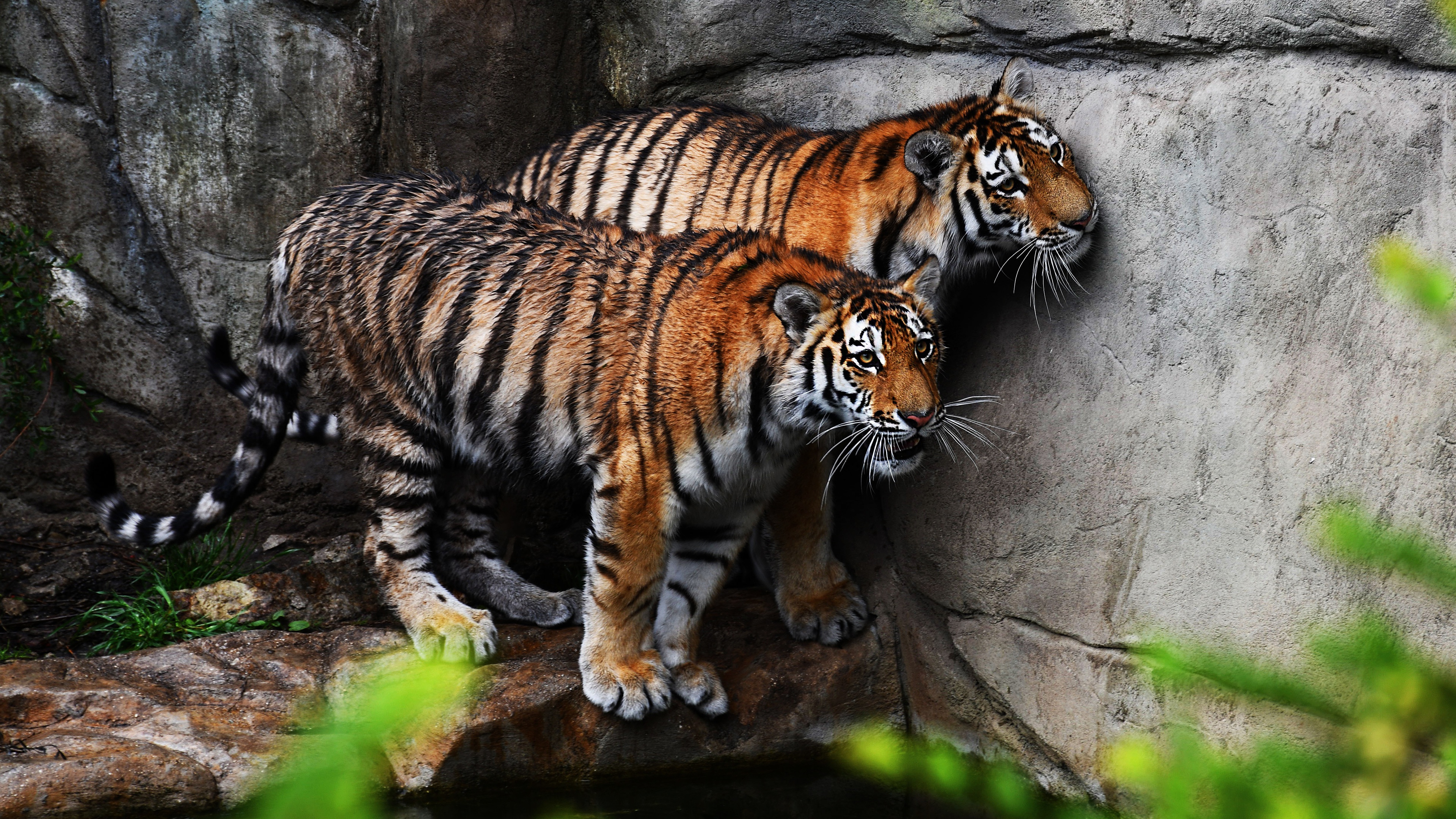 Description: Two tigers standing next to each other on a rock wall next to a pond of water and a rock wall.