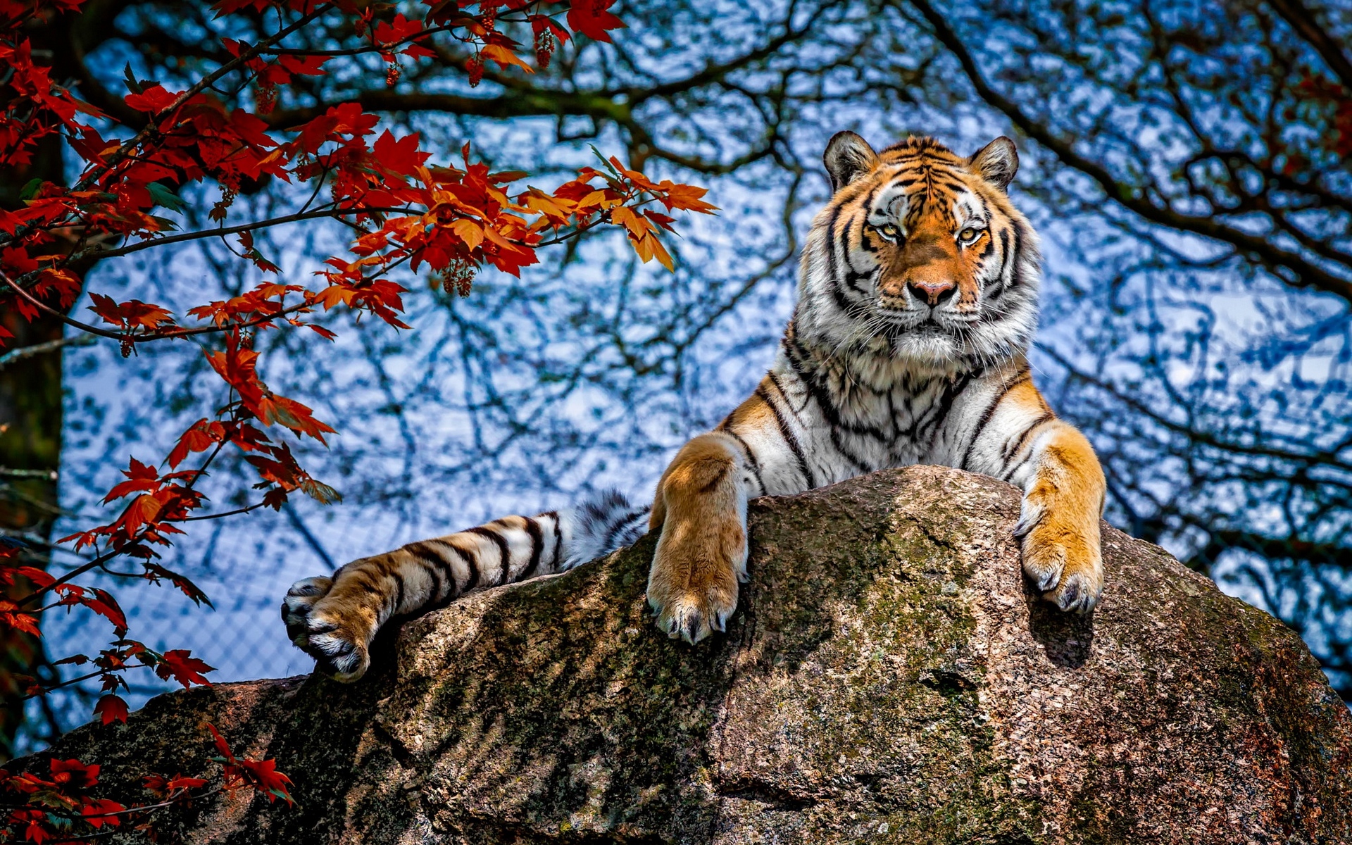 Description: A tiger sitting on top of a large rock next to a tree with red leaves on it's branches.