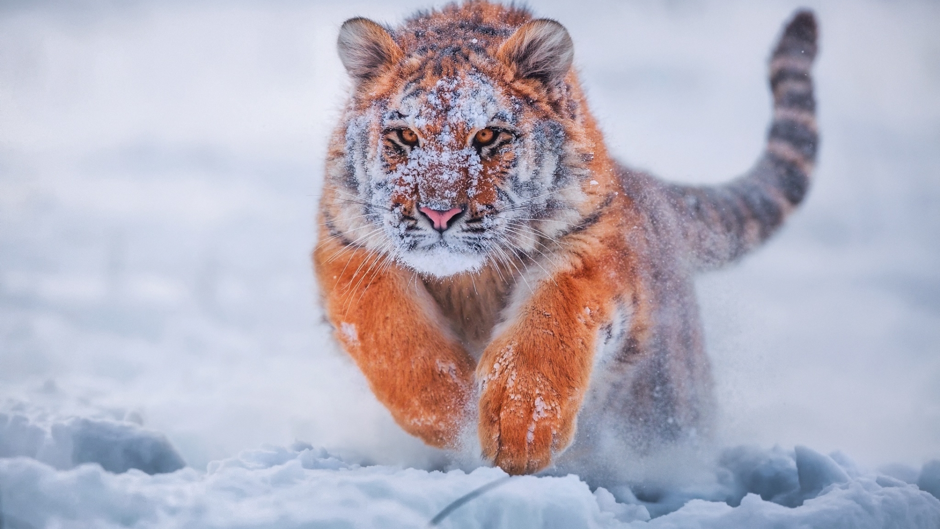 Description: A tiger running through the snow in the wild with it's front paws out and it's face slightly obscured by the snow.