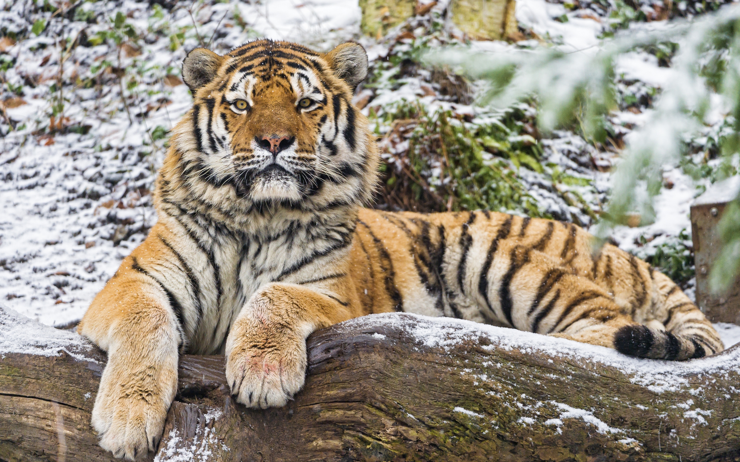 Description: A tiger laying on a log in the snow with snow on the ground behind it and trees in the background.