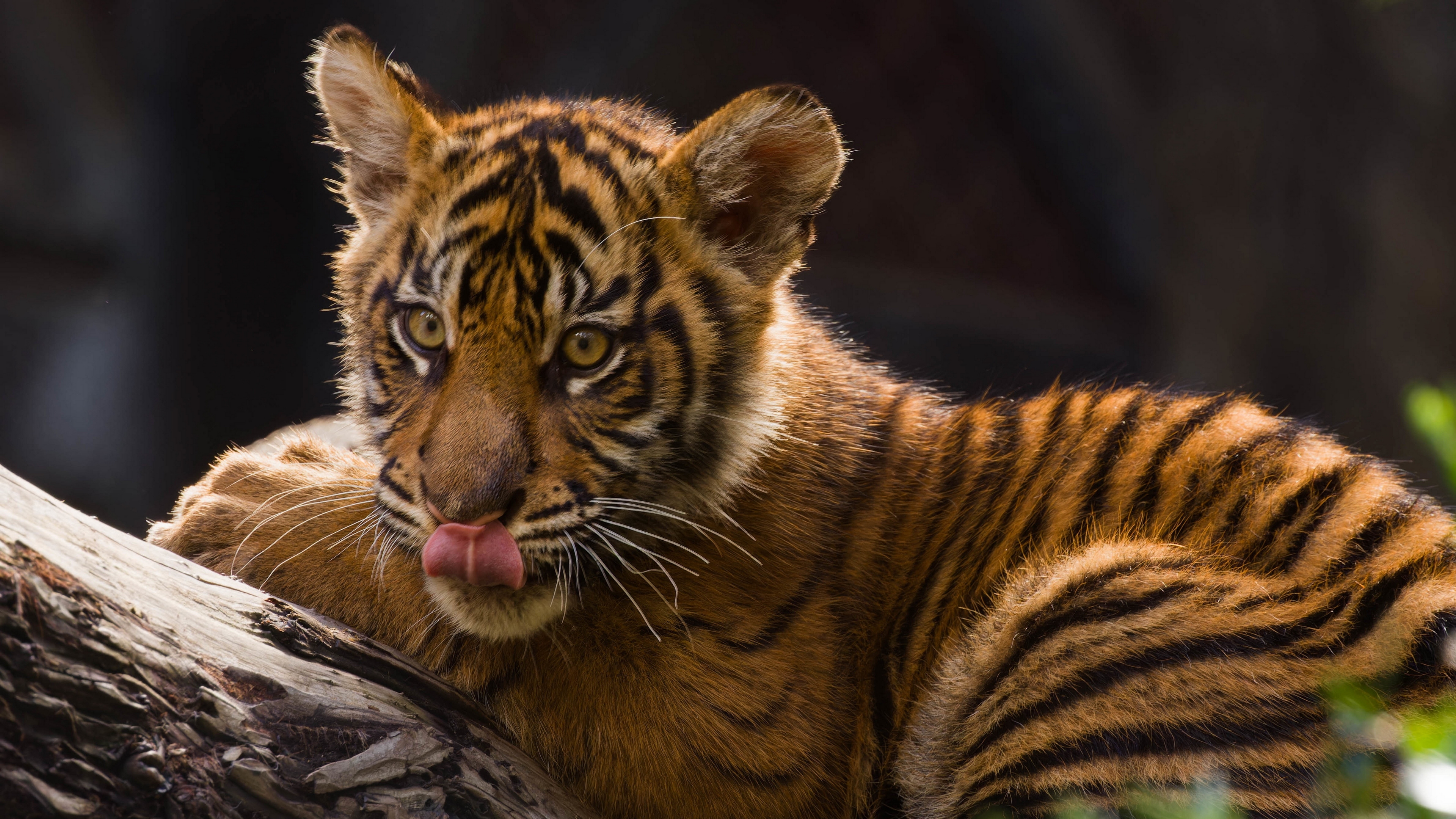 Description: A tiger laying on top of a tree trunk with its tongue out and tongue out.