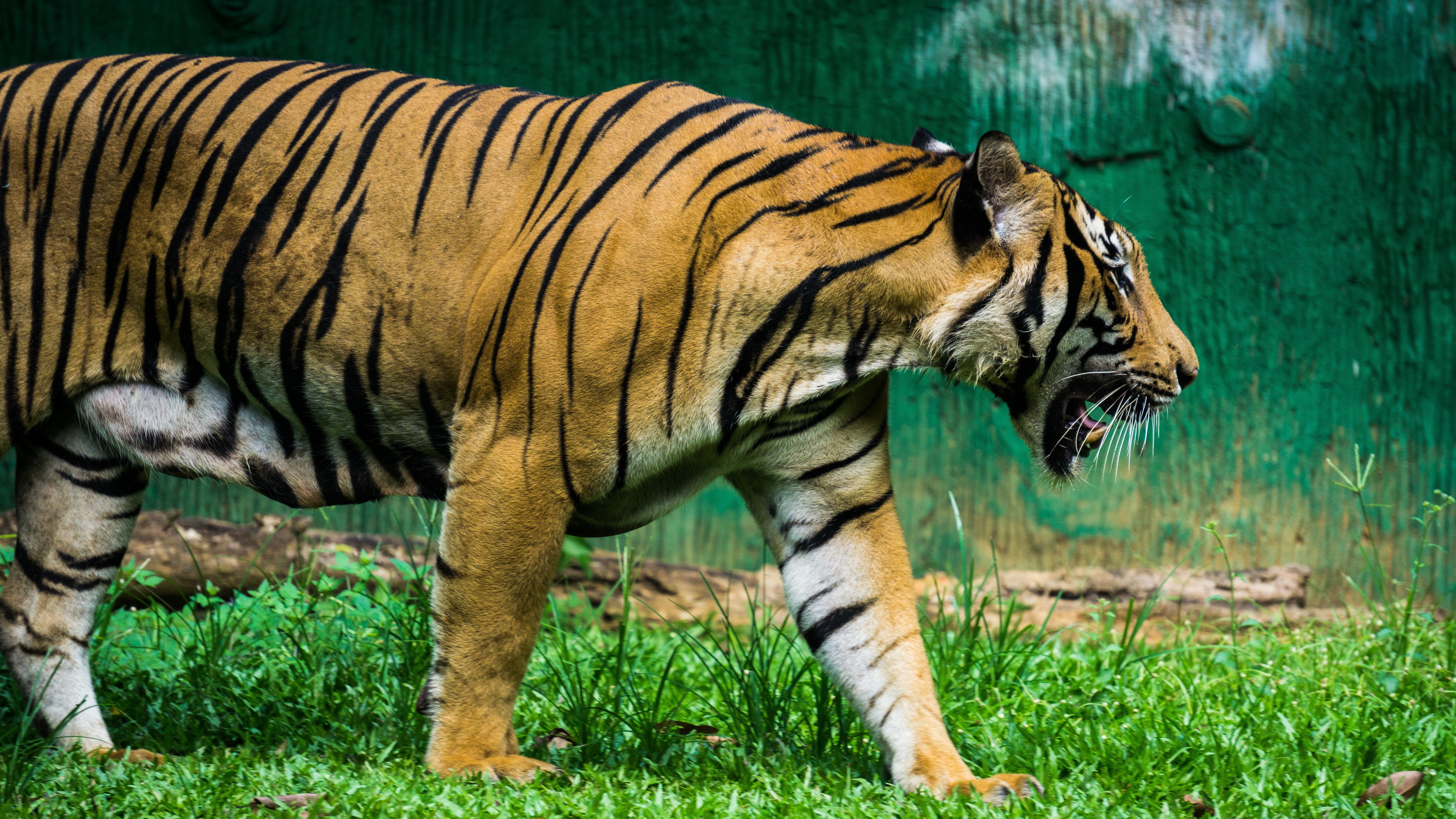Description: A tiger walking across a lush green field next to a forest of trees and bushes.