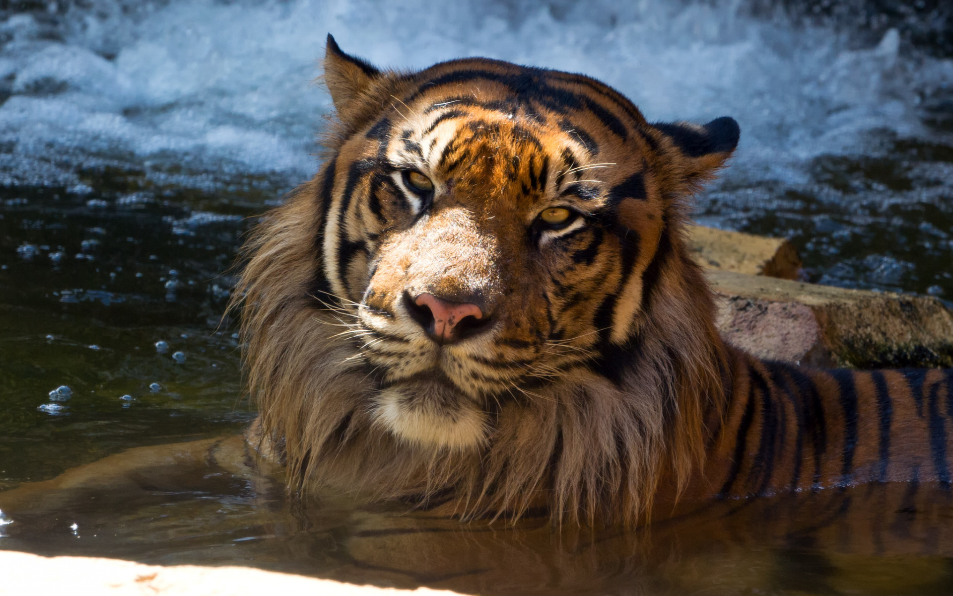 Description: A tiger is in the water near a waterfall and rocks and water is flowing down the side of it.