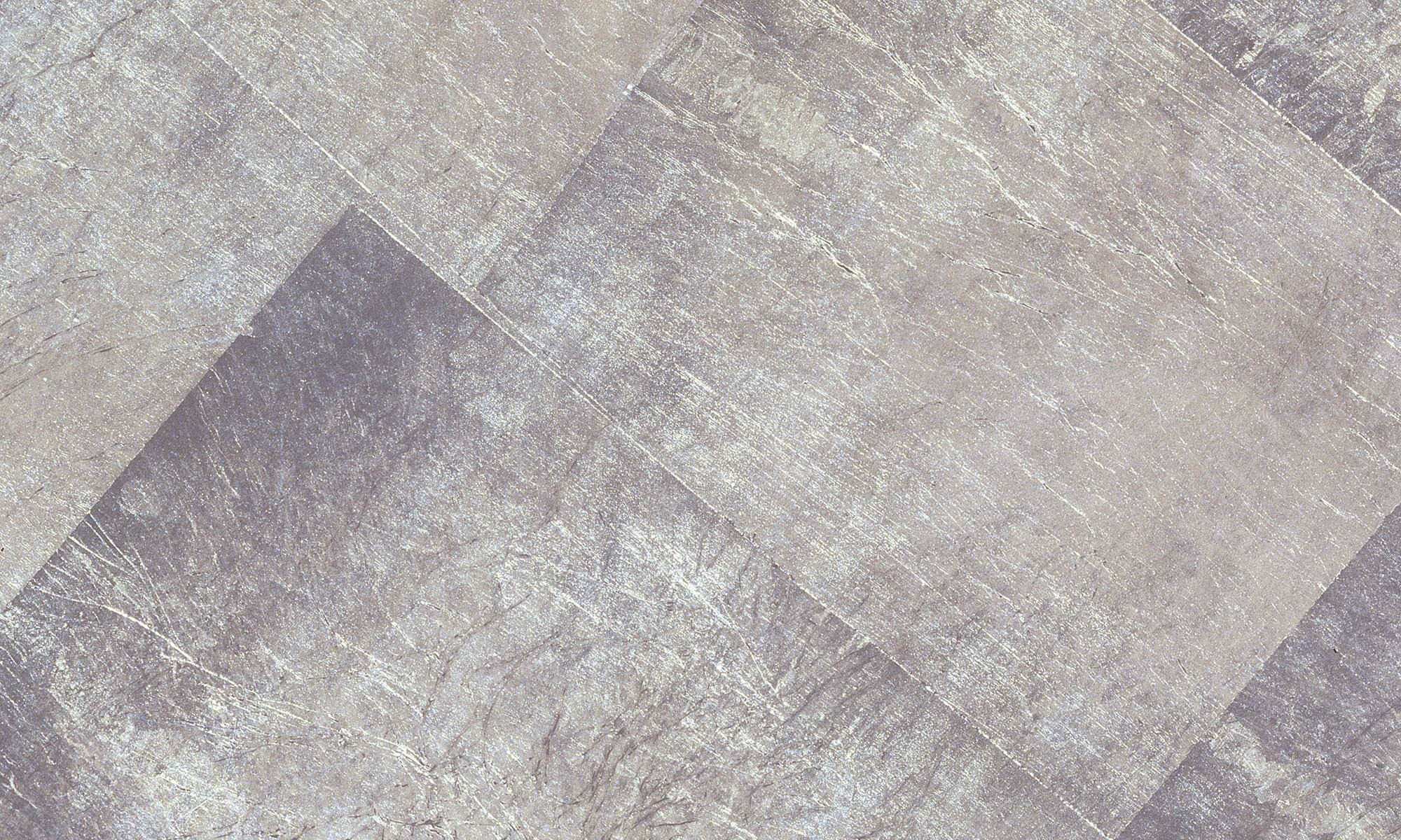 Description: A close up of a tile floor with a brown and white design on it's surface and a black and white clock.